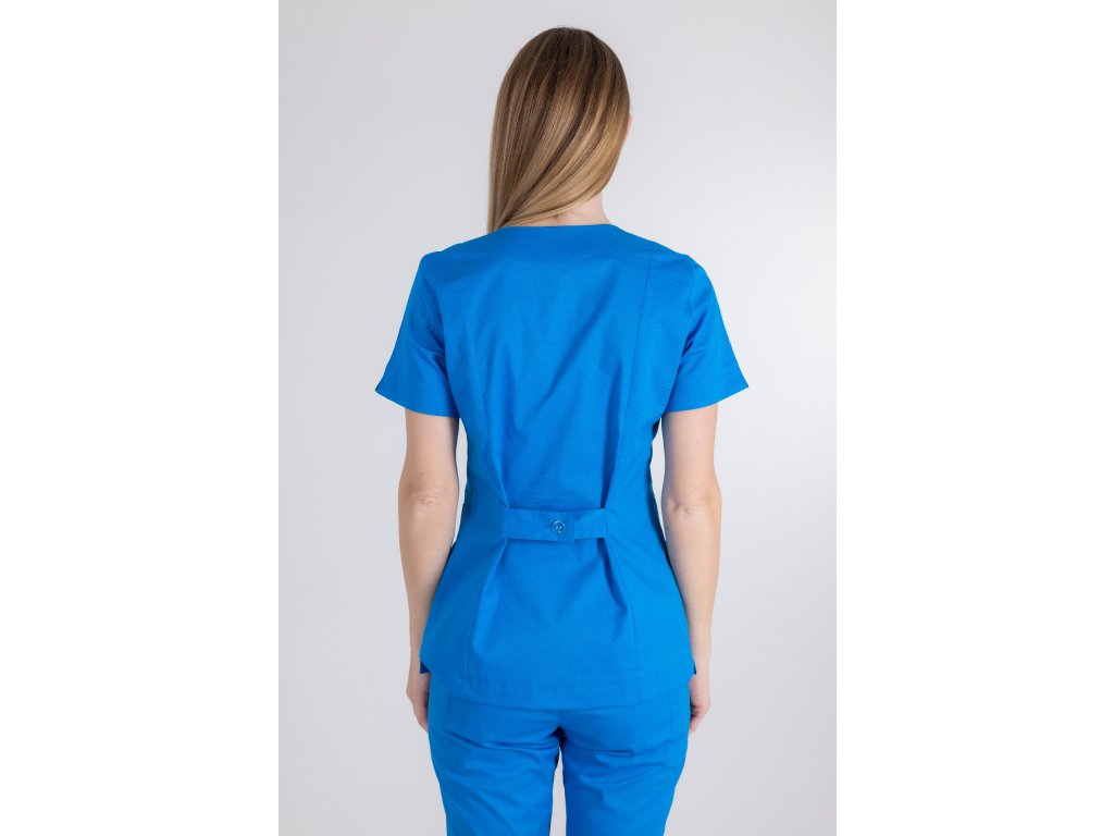- predné sedlo s tvarovaným výstrihom, krátky rukáv s malým rozparkom, krátky rozparok v boku
